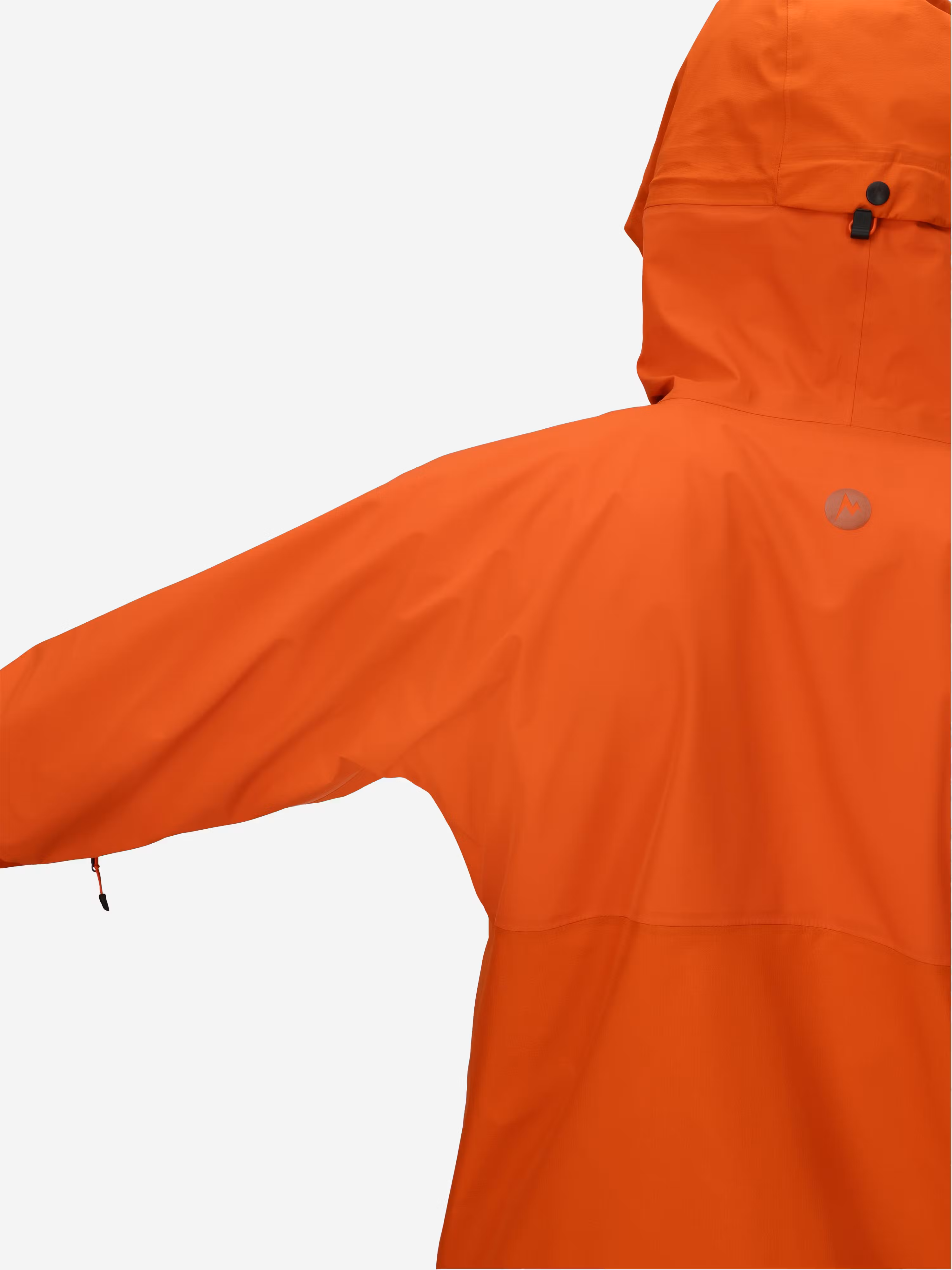 Features include an adjustable helmet-compatible hood, waterproof zippers, pit zips for ventilation, and zippered pockets accessible while wearing a backpack or harness. Its lightweight construction makes it easy to pack and carry.