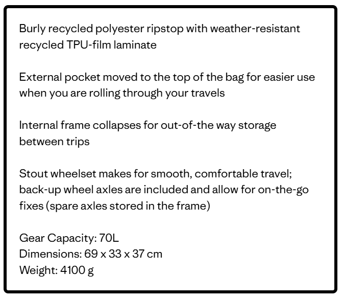 Black Hole® Wheeled Duffel 70L is perfect for gear-intensive weekends or multiweek travel. It delivers the same legendary performance you expect from our Black Hole® bags, but with a huge step toward environmental impact reduction with 100% recycled body fabric, lining and webbing, and now a pioneering recycled TPU-film laminate with a sleek matte finish.