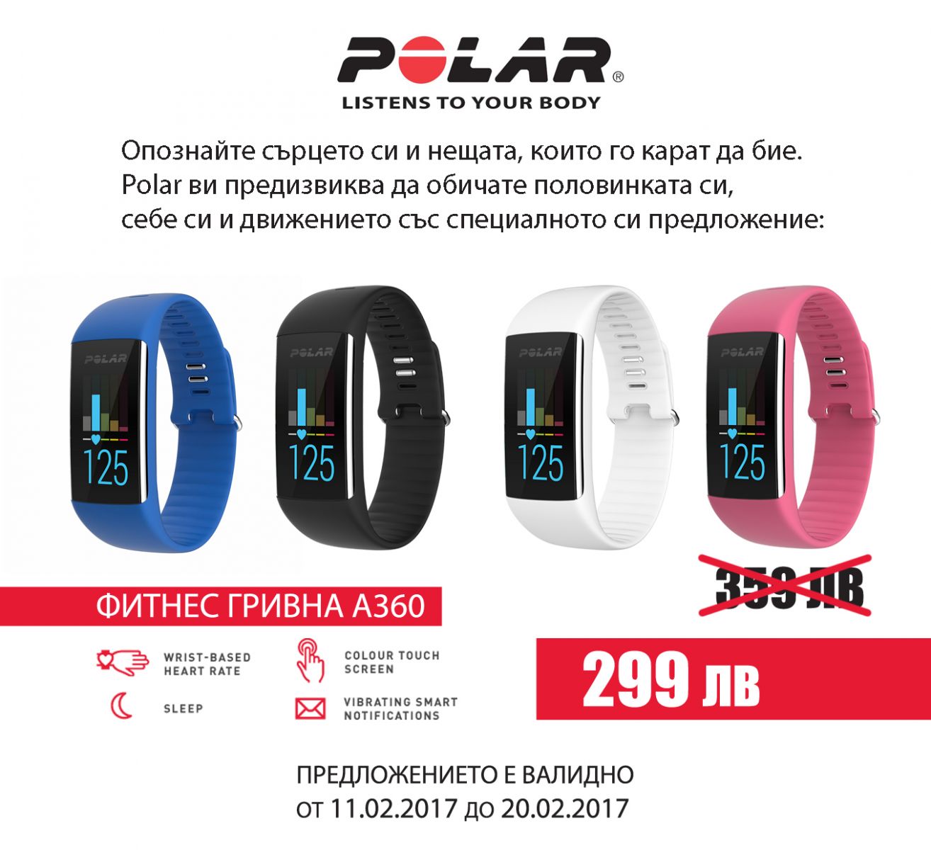 Покажете любов в най-любовния месец. Сега е моментът да опознаете сърцето си и да разберете какво го кара да бие по-силно! Фитнес гривната A360 от Polar ще се превърне във ваш личен треньор и ще ви стимулира за повече движение и активност. Само сега, A360 може да вземете на специална цена от 299лв. Февруари ви предизвиква - изразете любовта към себе си и хората, които обичате. Подарете красота, здраве и стимул за движение! A360 може да намерите в в магазини BaseCamp, верига магазини Технополис, магазини Scott Bulgaria, магазини Зора Магазини и iCorner.