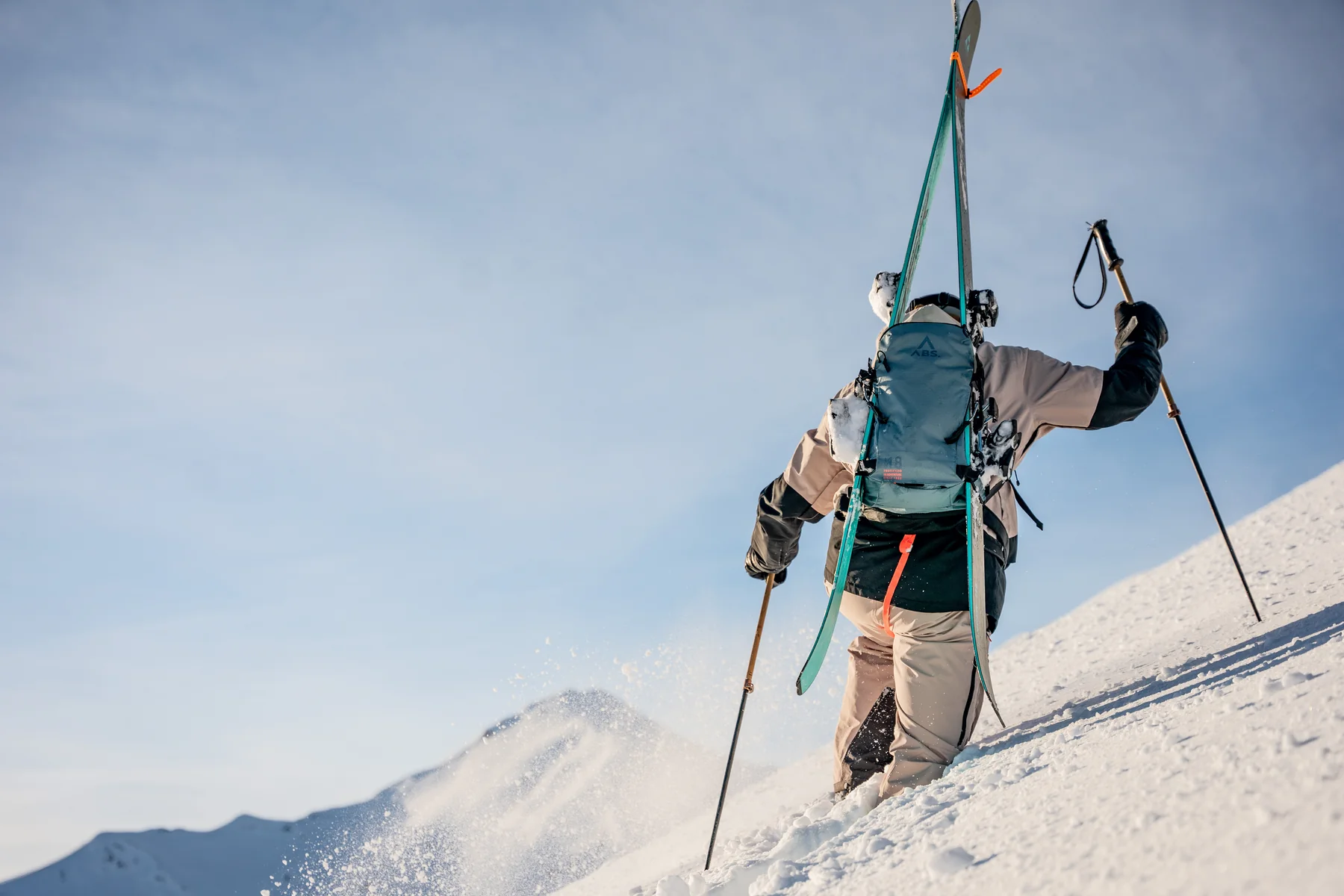Large, electric ABS avalanche backpack with zip-on system for multi-day tours