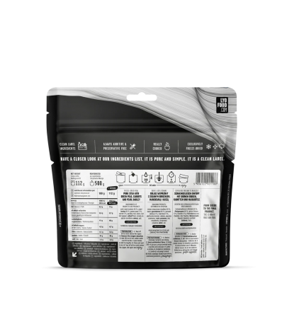 It’s easy to enjoy the outdoors with delicious food in your backpack. LYO Stew with Pearl Barley is a well-balanced dish created to give you plenty of energy for the final stretch of any adventure. Imagine tender pieces of pork and pearl barley dipped in a creamy sauce with a generous portion of veggies, including carrots, red bell peppers, green peas, parsley root, and onions. Packed with carbohydrates and protein, this is the perfect fuel for what’s waiting for you just around the corner.