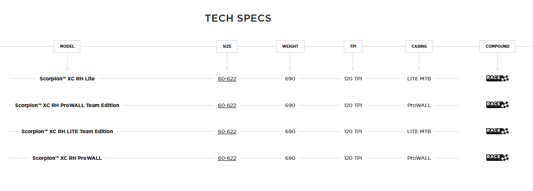 Избрана от професионалните отбори на Pirelli в Световните купи по крос-кънтри и маратон, Scorpion™ XC RH е идеалният избор за колоездачи, които търсят всяко възможно предимство в състезателни условия. Тази гума съчетава рекордна скорост с необходимия контрол за справяне с всички съвременни предизвикателства в XC дисциплините.