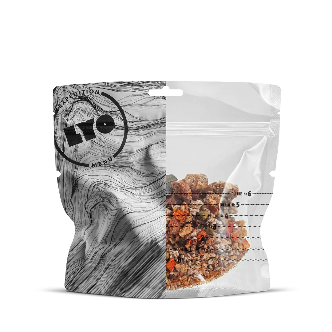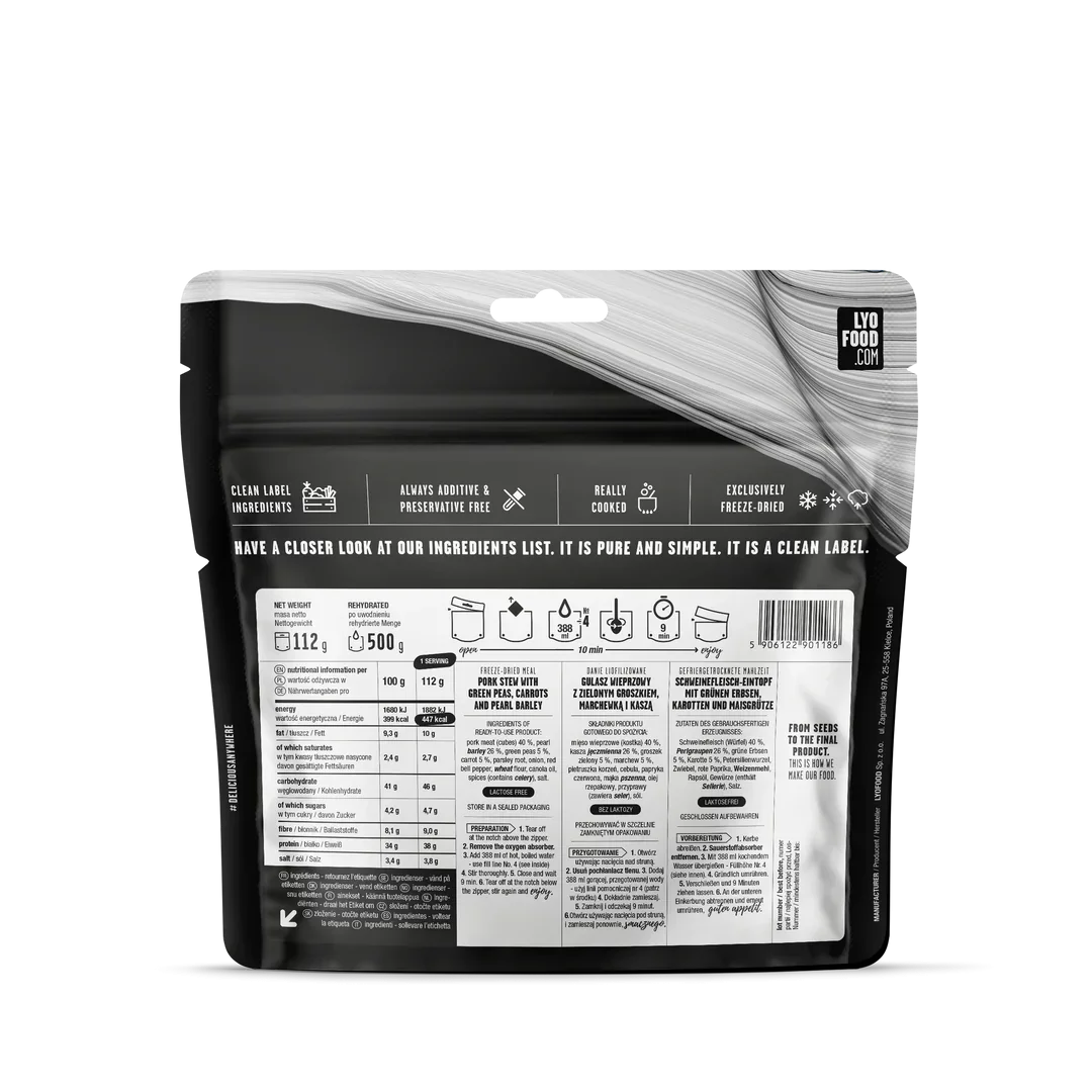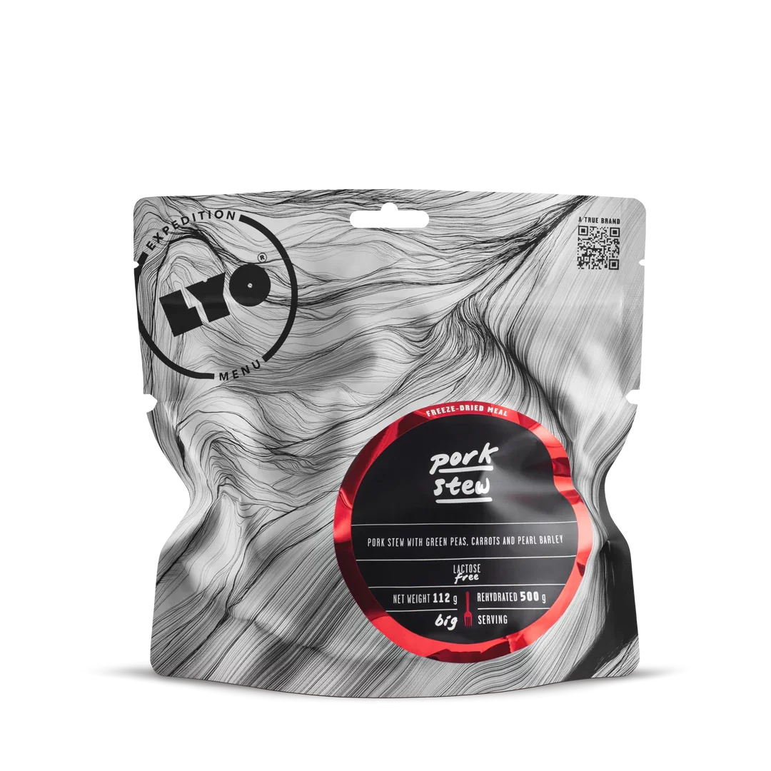 Наслади се на вкусна и питателна храна дори в най-отдалечените кътчета на природата. LYO Pork Stew е добре балансирано ястие, специално създадено да осигури нужната енергия за приключения на открито. Комбинира крехки парчета свинско месо с перлен ечемик и богата, кремообразна сосова основа. Добавени са моркови, червена чушка, грах, корен от магданоз и лук – всичко това заедно в едно вкусно и сгряващо ястие.